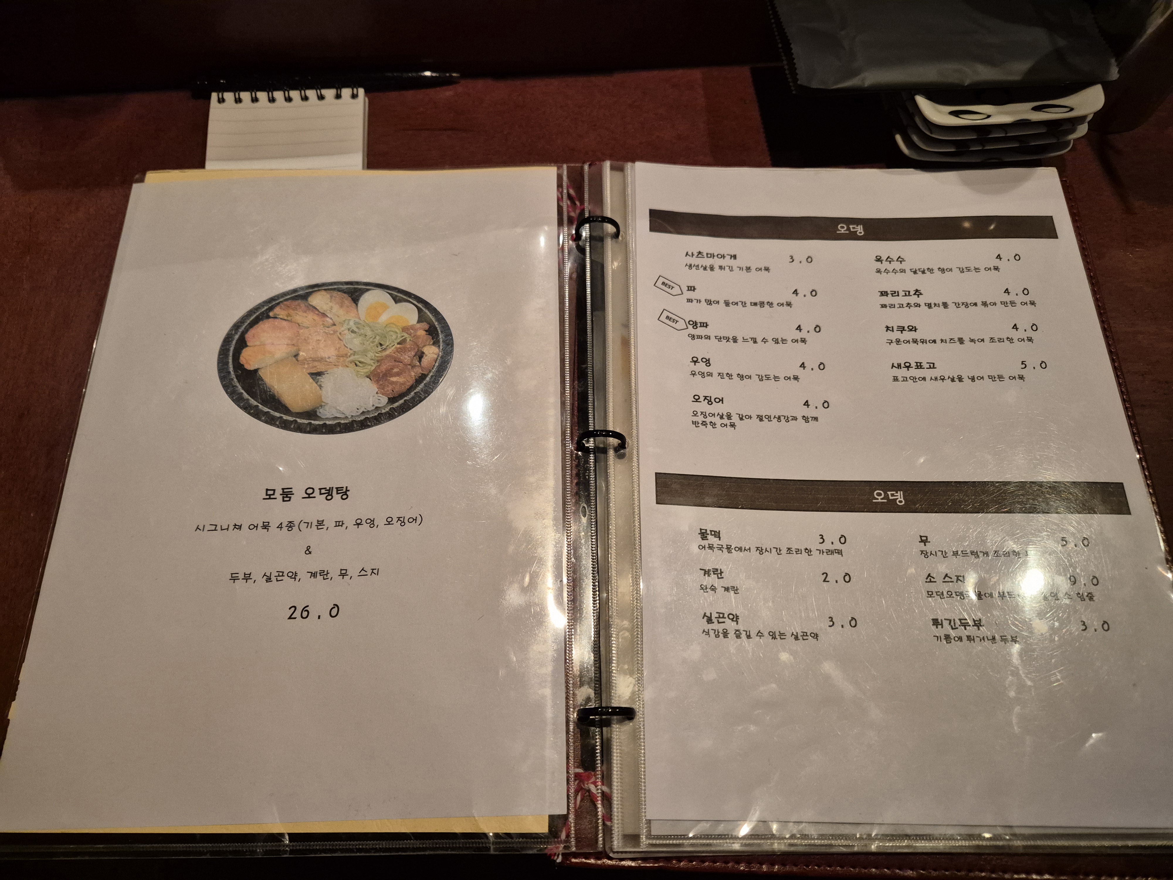 메뉴. 오뎅류와 일품요리 몇가지를 판다.