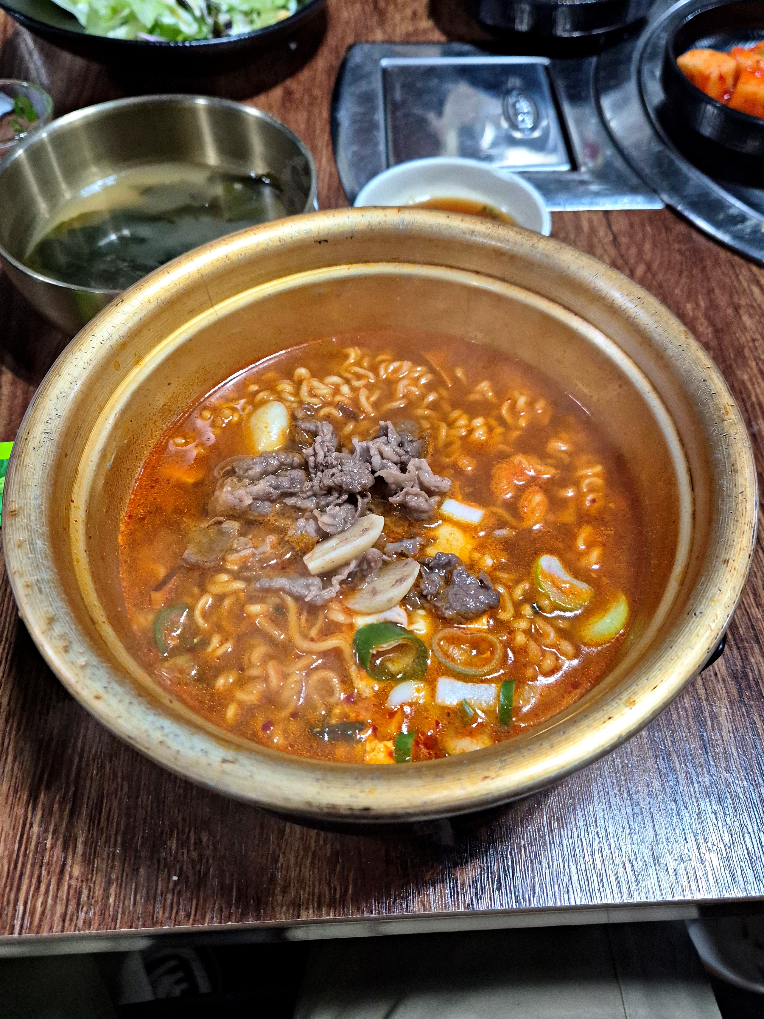 차돌라면(6천원). 차돌을 넣고 끓인 라면인데 차돌은 적었지만 맛있었음. 칼칼하고 꼬들하게 잘 끓여내서 한우의 느끼함을 싹 씻어주더라.