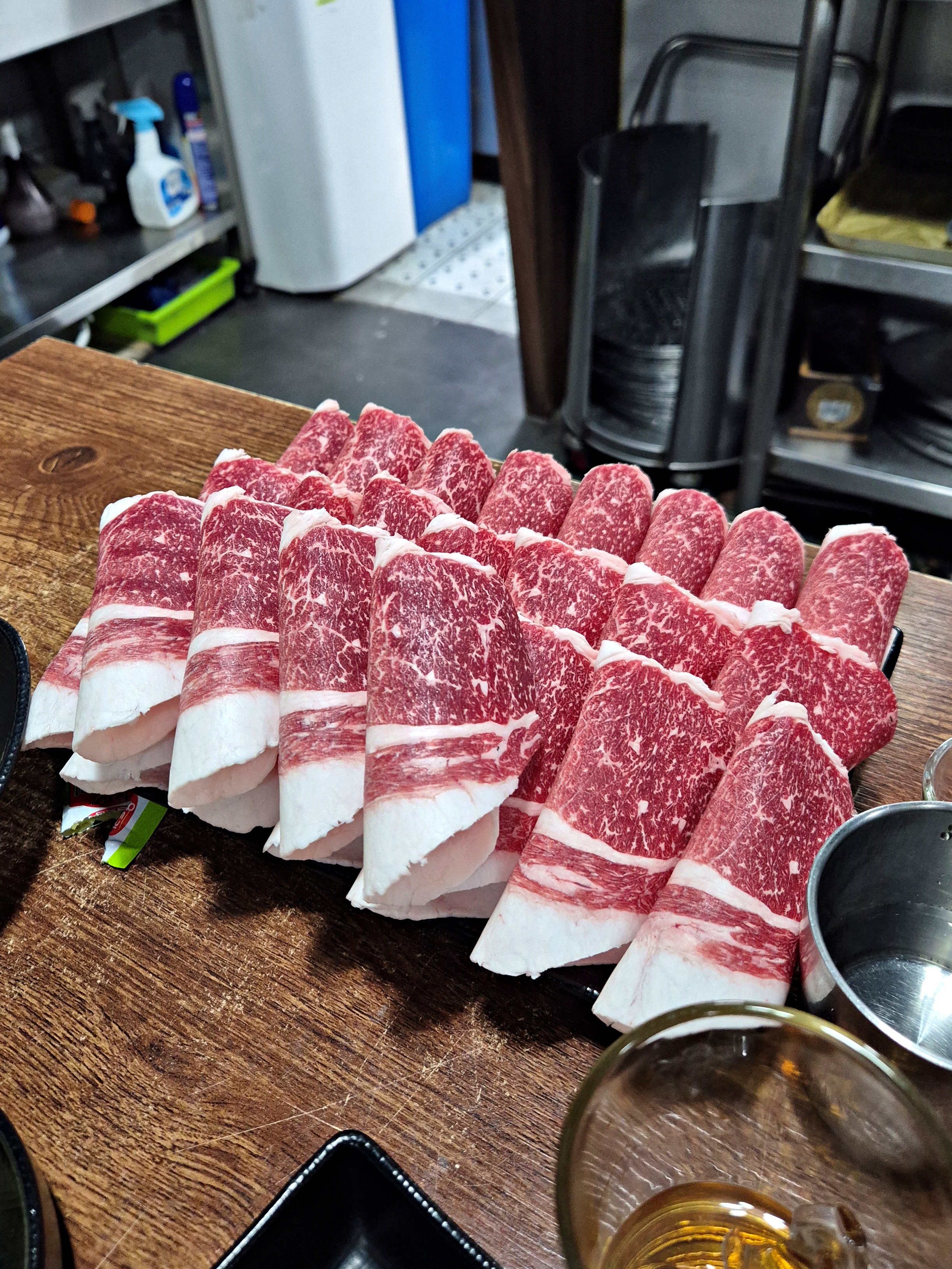 새우살(200g 102천원). 등심을 둘러싸고 있어 등심덧살이라고 부르는 부위인데 우리나라 사람들이 선호하는 부위인지 어느 식당에서건 특수부위랍시고 비싸게 파는 부위다. 굉장히 마블링이 심하고, 버터 같이 녹는듯한 부드러운 식감이 특징인데 개인적으로는 너무 느끼해서 좋아하지 않는 부위다. 맛 자체는 화려한데 1~2점 먹으면 물린다.