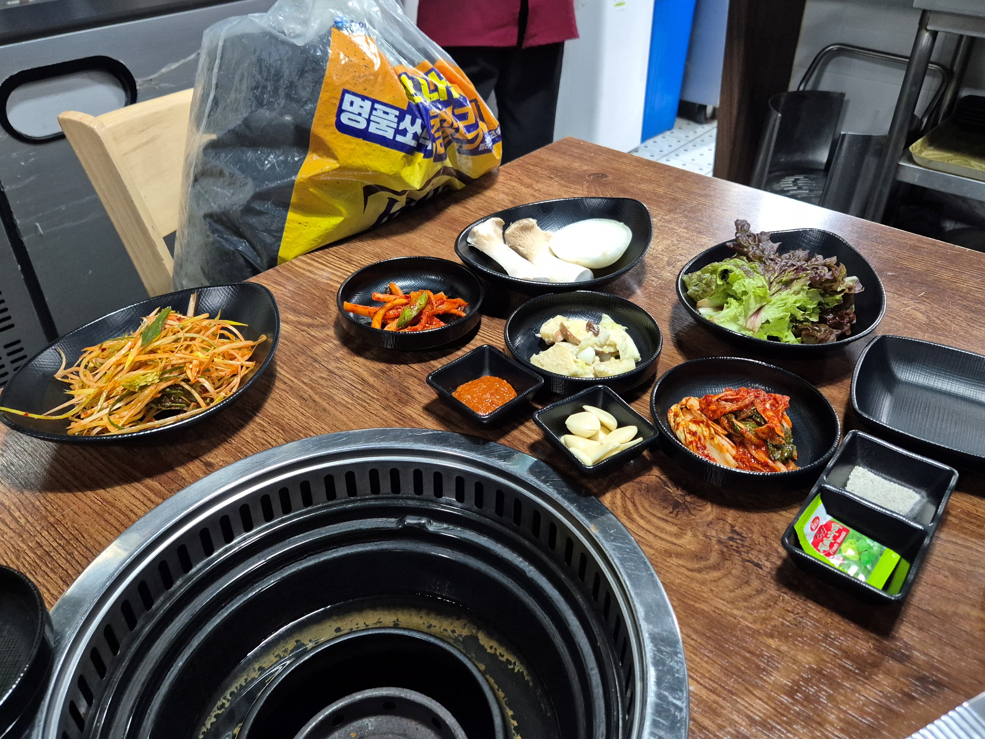 기본찬. 기본찬은 심플한 편. 구이용 야채는 더 달라하면 더 주셨던 듯.
