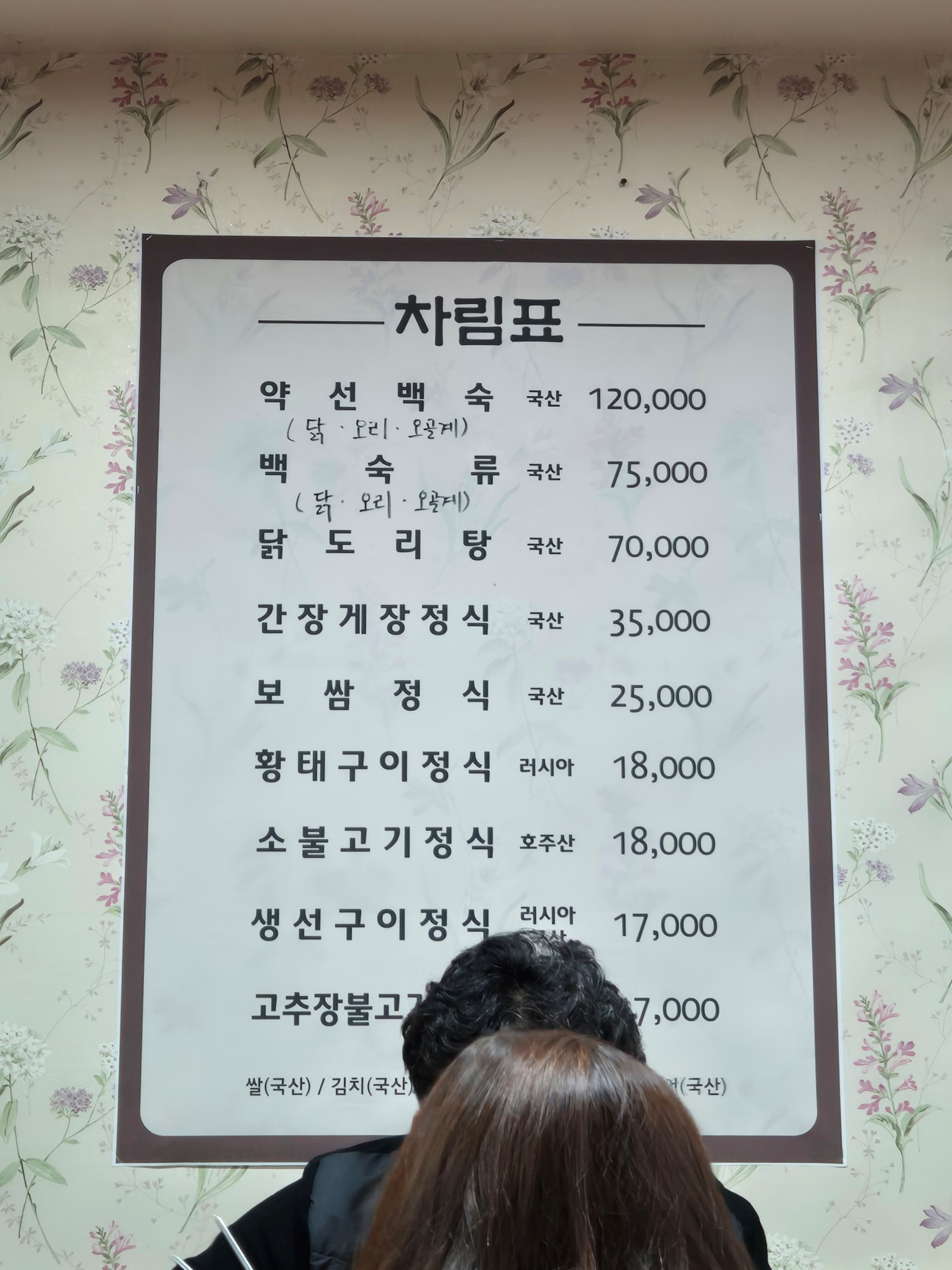 메뉴. 아침에는 아침반상 정식이라고 12천원 짜리 식사를 판다.