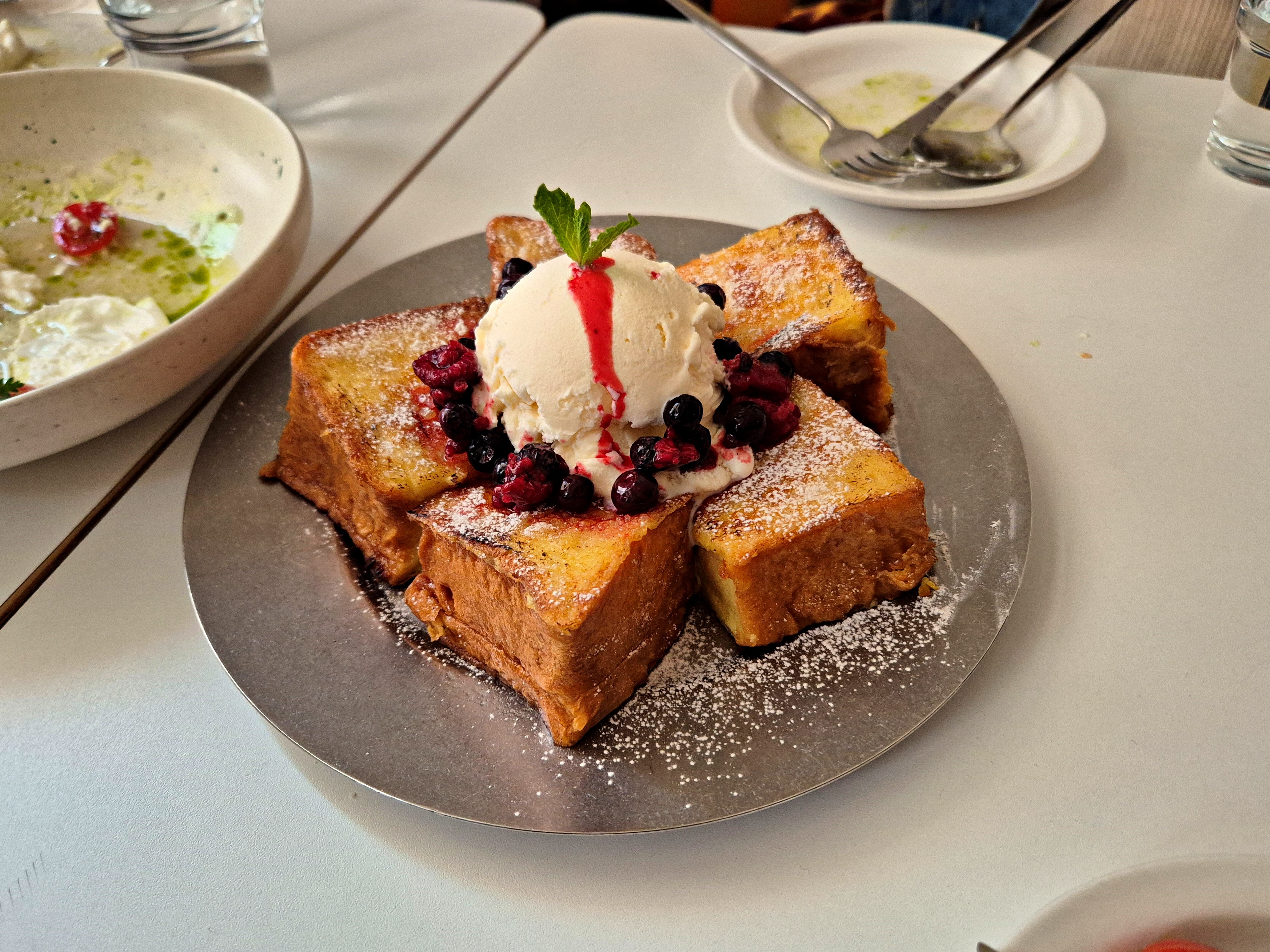 프렌치 토스트(19천원). 두껍게 만든 프렌치 토스트에 바닐라 아이스크림과 베리류를 곁들였다. 뭐 아는 맛인데 맛있는 맛 ㅋㅋㅋ 혈당 스파이크의 맛?