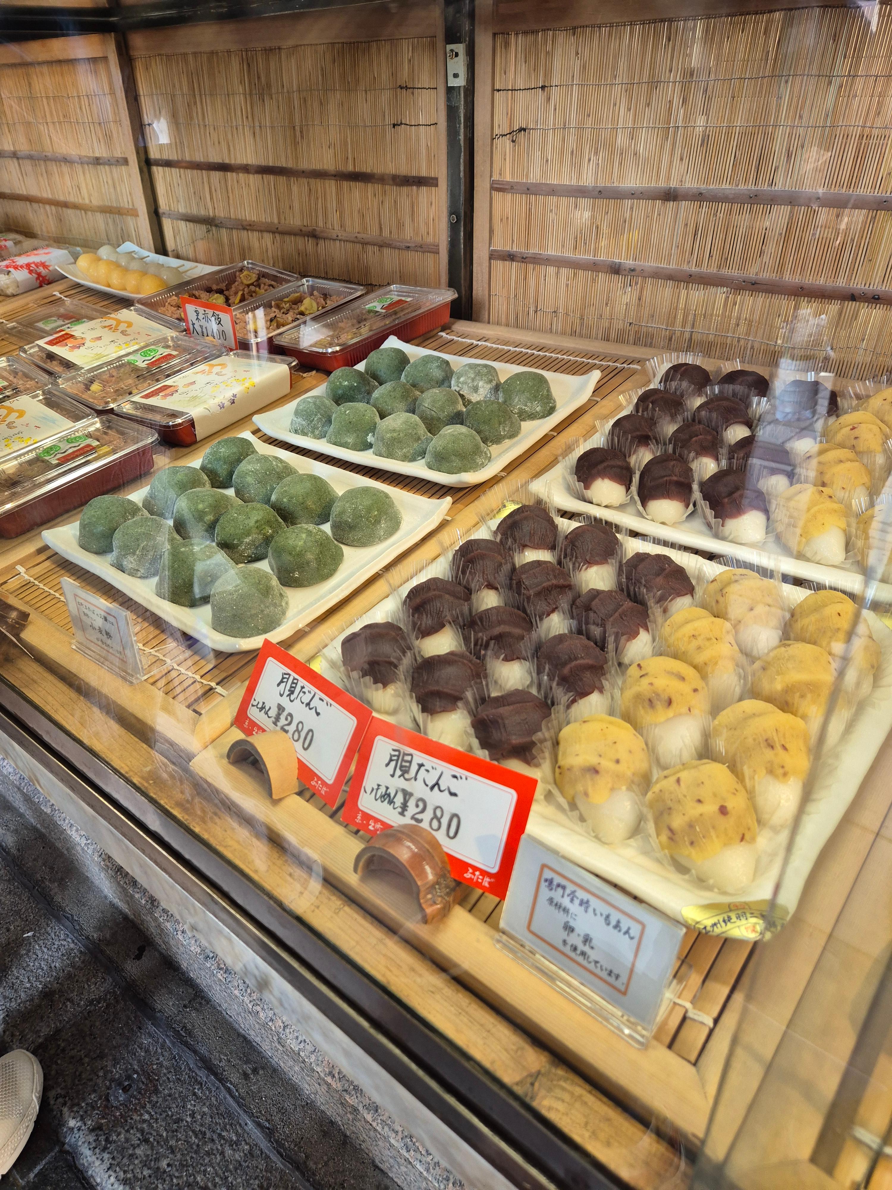 관광객, 현지인 모두 많았던 떡집이었는데 동네 어르신들이 많이 오시더라. 시간이 지날수록 줄이 훨씬 길어졌음. 테이크아웃만 가능한 떡집이라 줄은 빠르게 줄어든다. 아 10월초의 교토의 날씨는 꽤나 더운 편인데 기온이 막 엄청 더운 것은 아니지만 햇살이 진짜 엄청나게 뜨거움. 아무튼 반바지 반팔 필수고, 저녁 되어도 1도 춥지 않다.