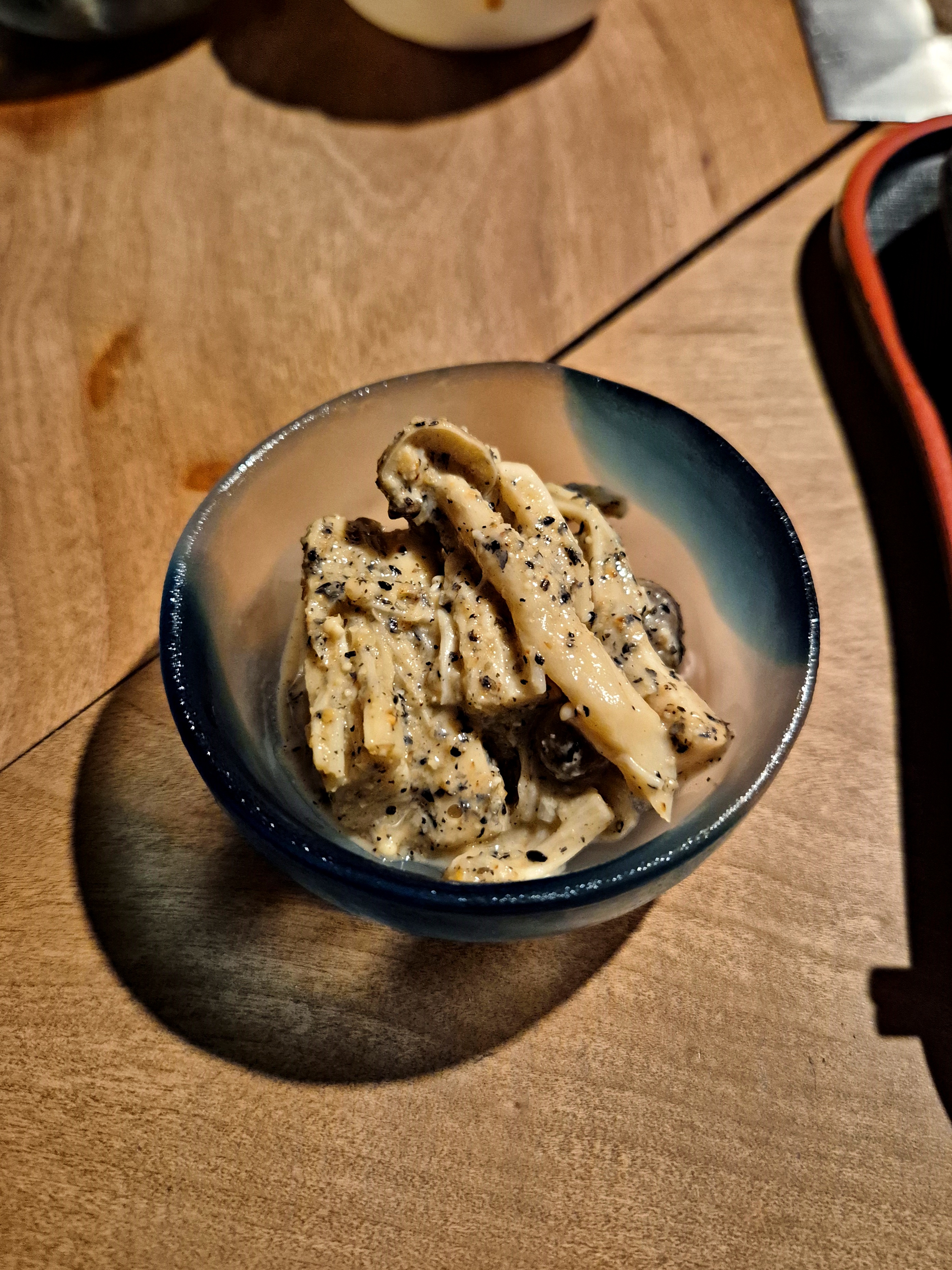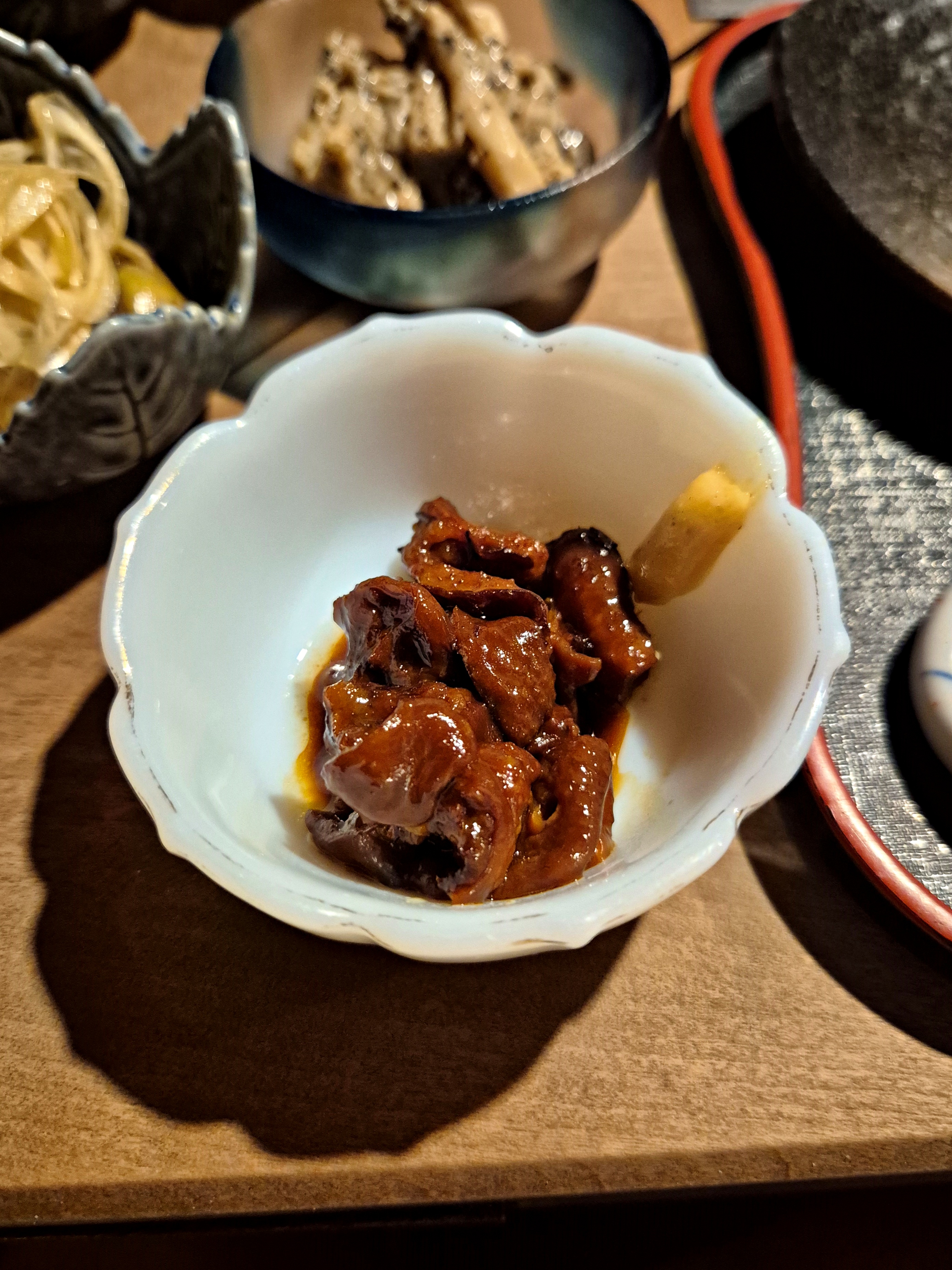 전채. 버섯 참깨무침, 닭껍질 데리야키 조림, 폰즈소스를 곁들인 가지와 대파. 일본음식 특유의 단맛이 느껴지는 메뉴들이었는데 무난하게 괜찮았음. 내 취향엔 좀 더 산미가 더 곁들여진 전채가 낫지 않나 싶다.
