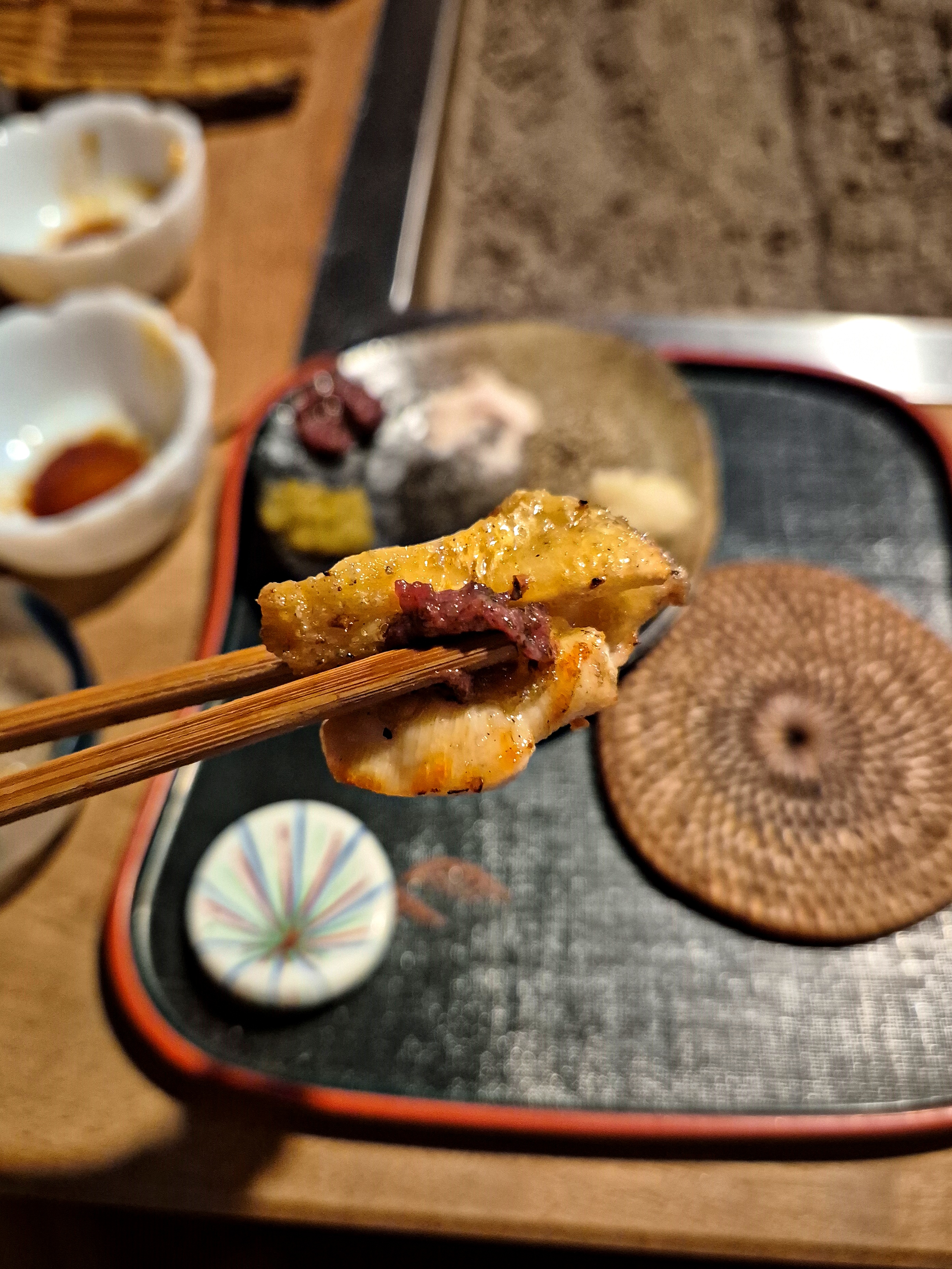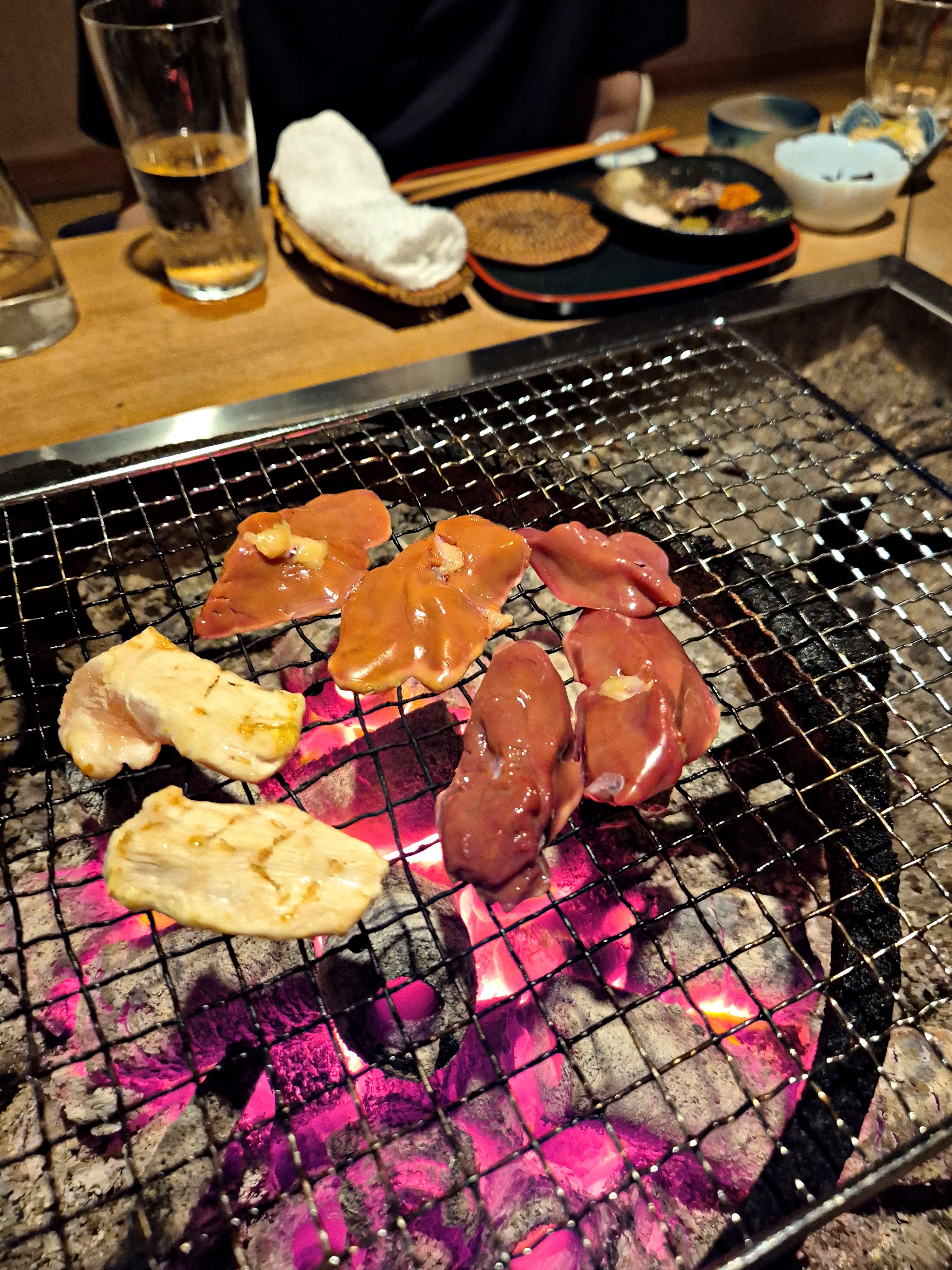 이제 닭 숯불구이가 시작된다. 아마 일본 지도리를 쓰시는 것 같은데 정확히 어떤 지도리인지는 모르겠다. 빛깔이 정말 아름다워서 선도가 아주 훌륭하다고 느껴졌음.