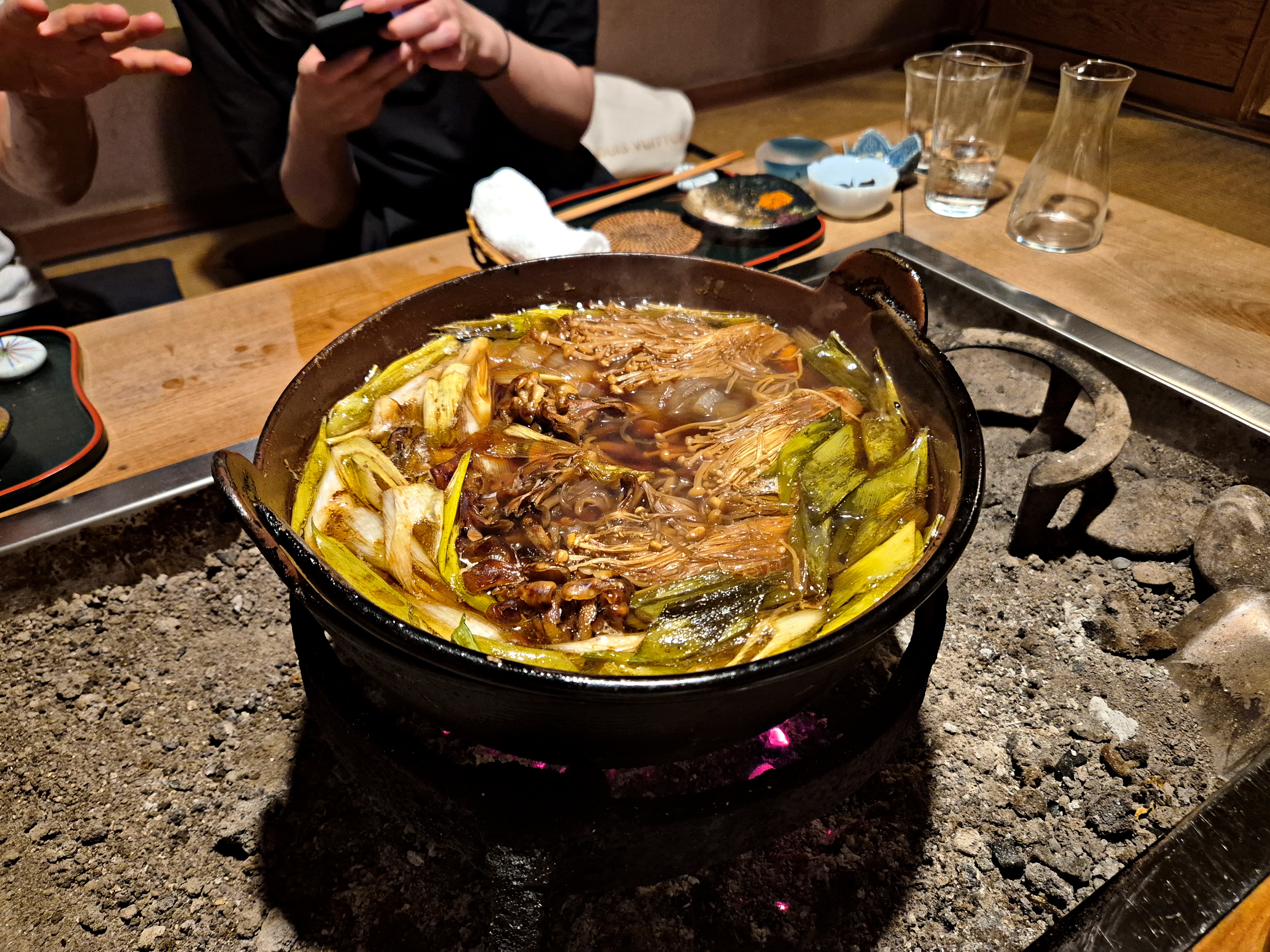 구이가 끝나면 스키야키가 나온다. 관서지방이라 관서식 스키야키가 나올 줄 알았는데 국물이 많은 관동식 스키야키 스타일로 나왔다. 고기가 별로 없네? 라는 생각이 들어서 뒤집어보면 진짜 고기가 어마무시하게 들어가 있다. 아마 닭을 잡고 구이에 쓴 고기 외의 고기를 여기에 넣지 않았나 싶다.