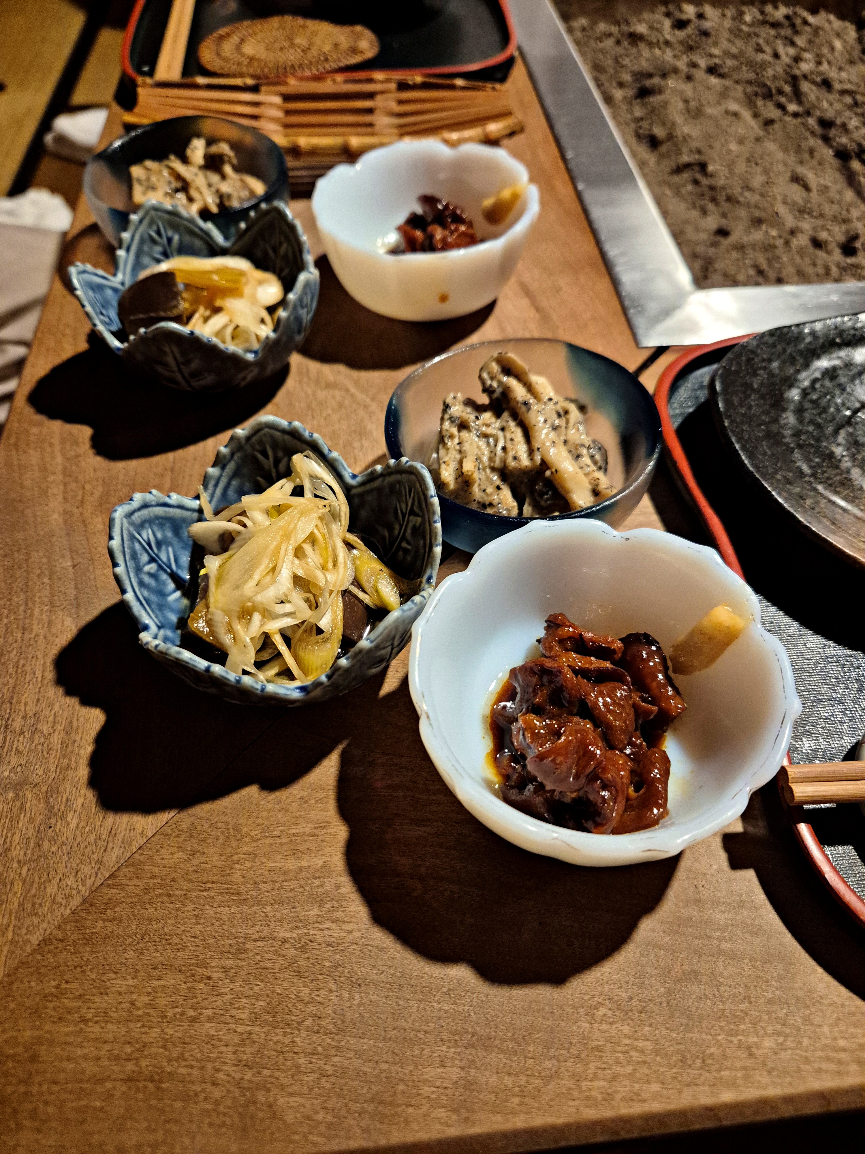 구이가 물리지 않도록 7가지 소스가 제공된다. 소금, 후추, 간마늘, 시치미, 와사비, 유즈코쇼, 우메보시 이렇게 나옴. 여러가지 조합으로 고기를 먹다보면 확실히 덜 물린다.