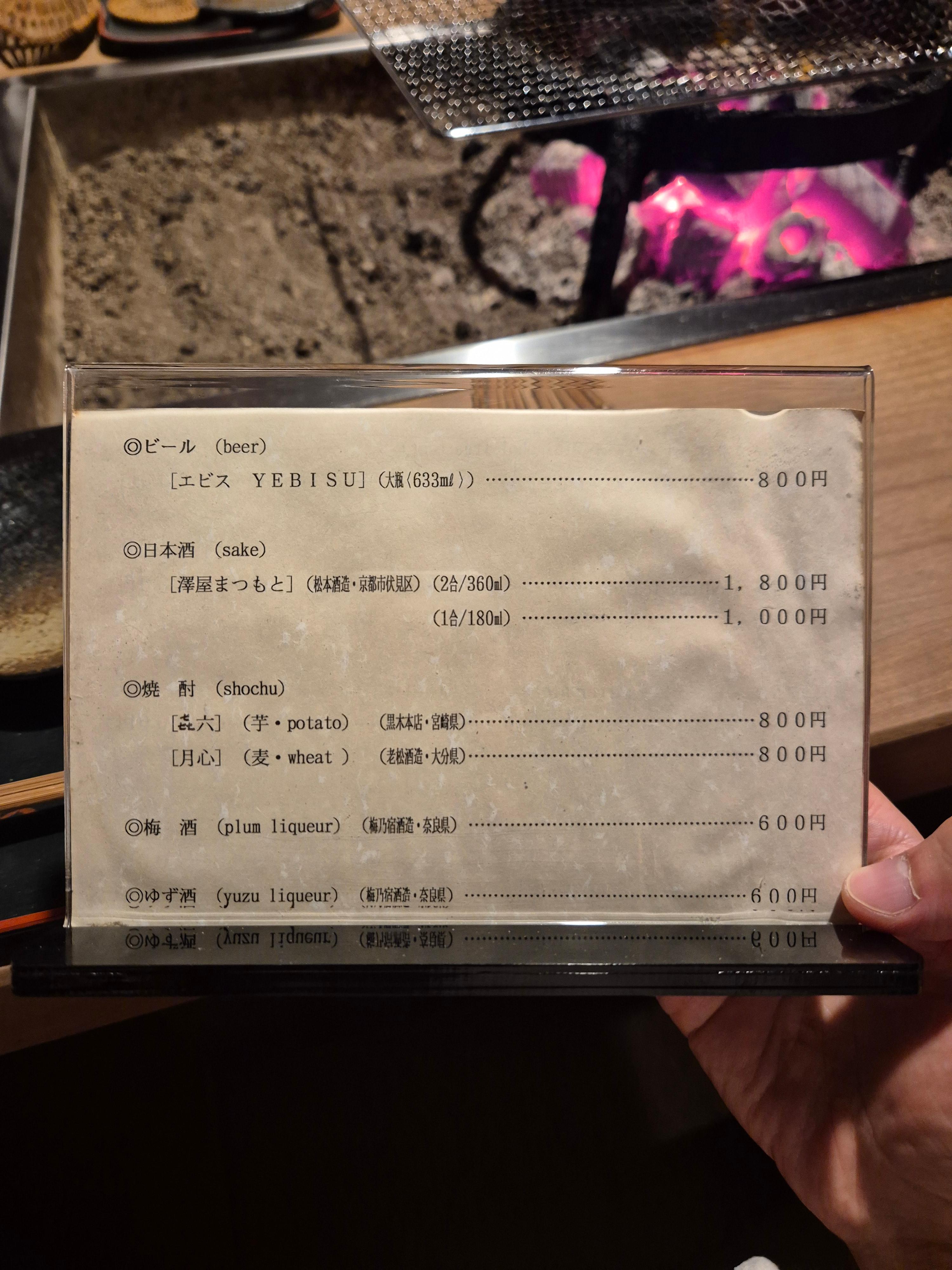 주류 및 음료 메뉴. 주류 가격은 이런 코스요리 음식점 치고는 합리적인 편이다. 음식은 인당 8천엔이었나? 아무튼 단일 코스메뉴다.