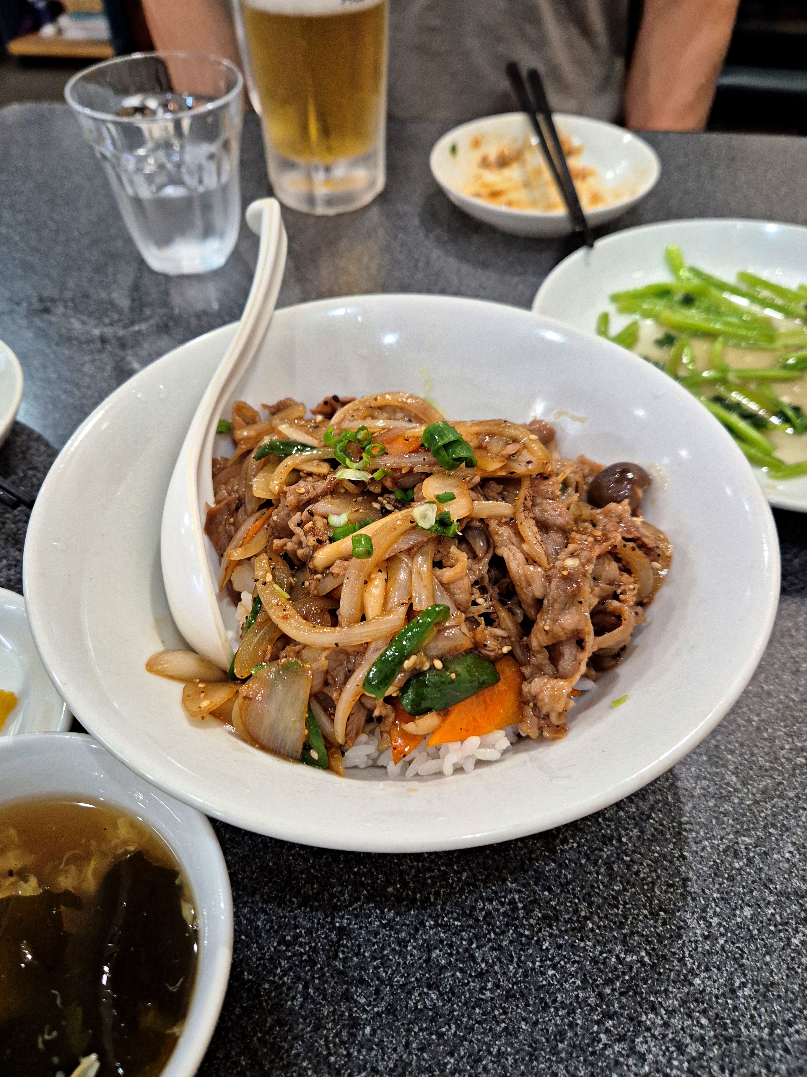 소고기구이덮밥(1,200엔). 불향 가득한 소고기와 야채볶음이 올라간 덮밥메뉴다. 우리가 흔히 예상 할법한 맛임.