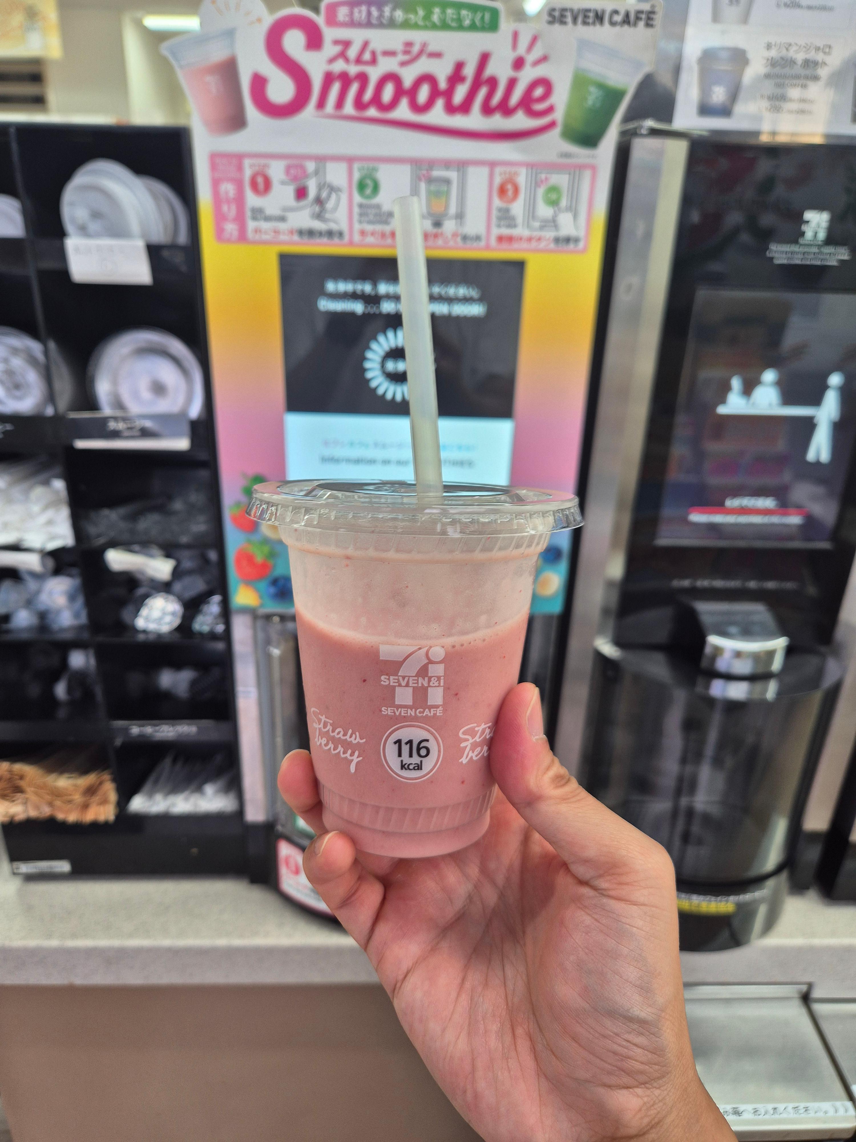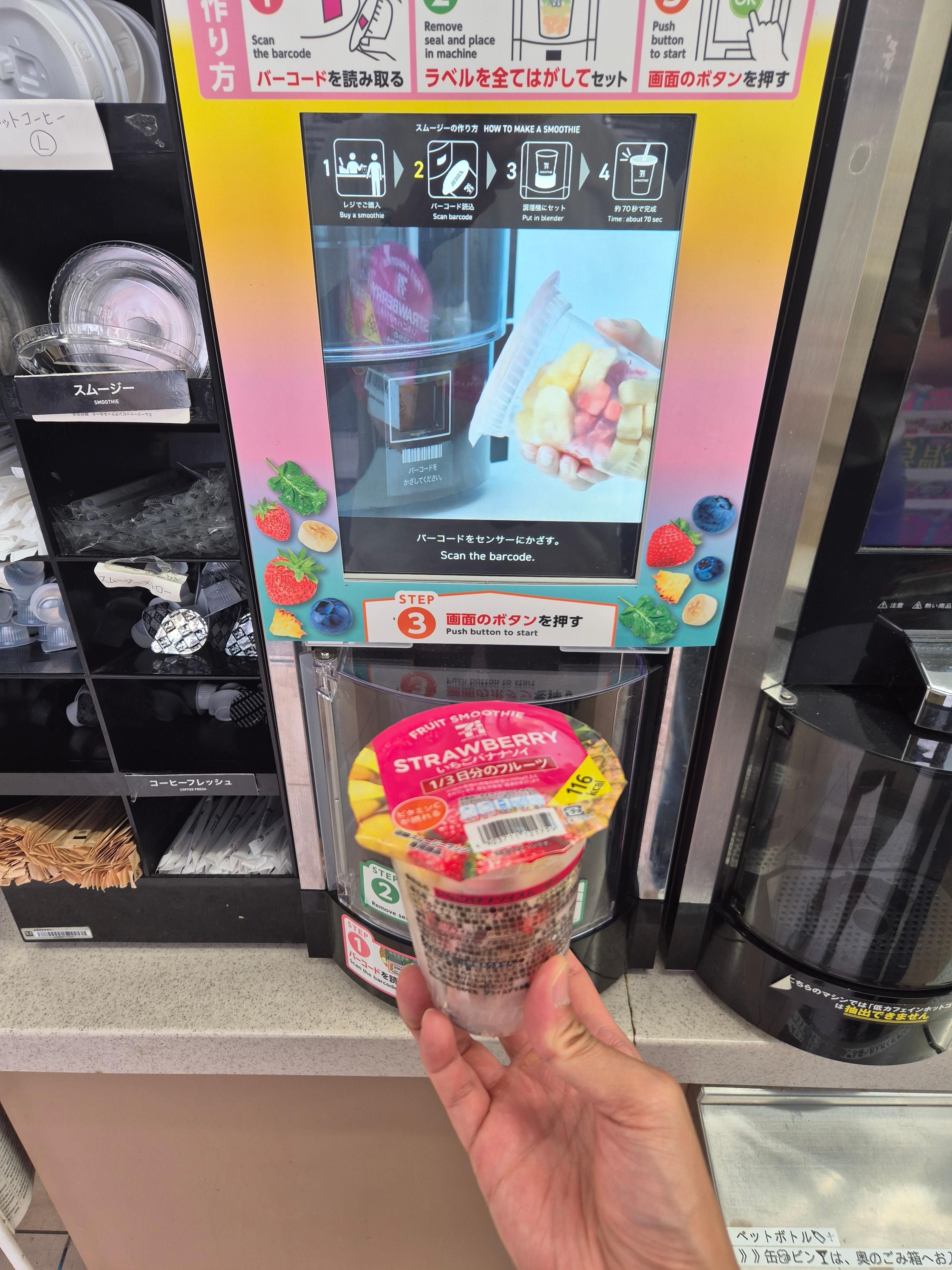 역시 일본여행에 오면 편의점 털이를 반드시 해야한다. 도쿠시마역 근처에는 세븐일레븐이 있는데 세븐일레븐 온김에 추성훈 유튜브에 나온 스무디가 궁금했다. 냉동고에서 이렇게 냉동 과일이 들어 있는 용기를 가져오면 됨.