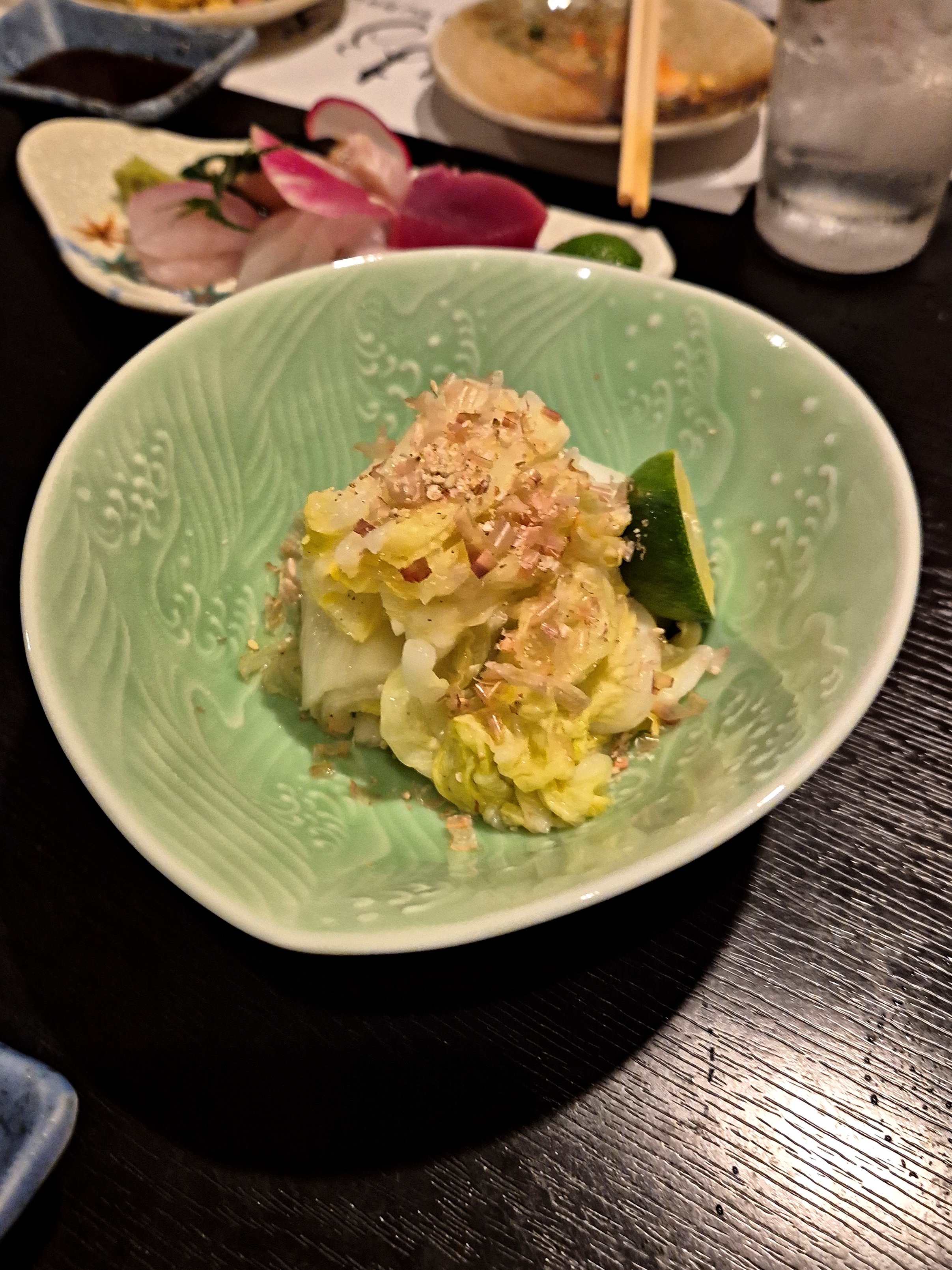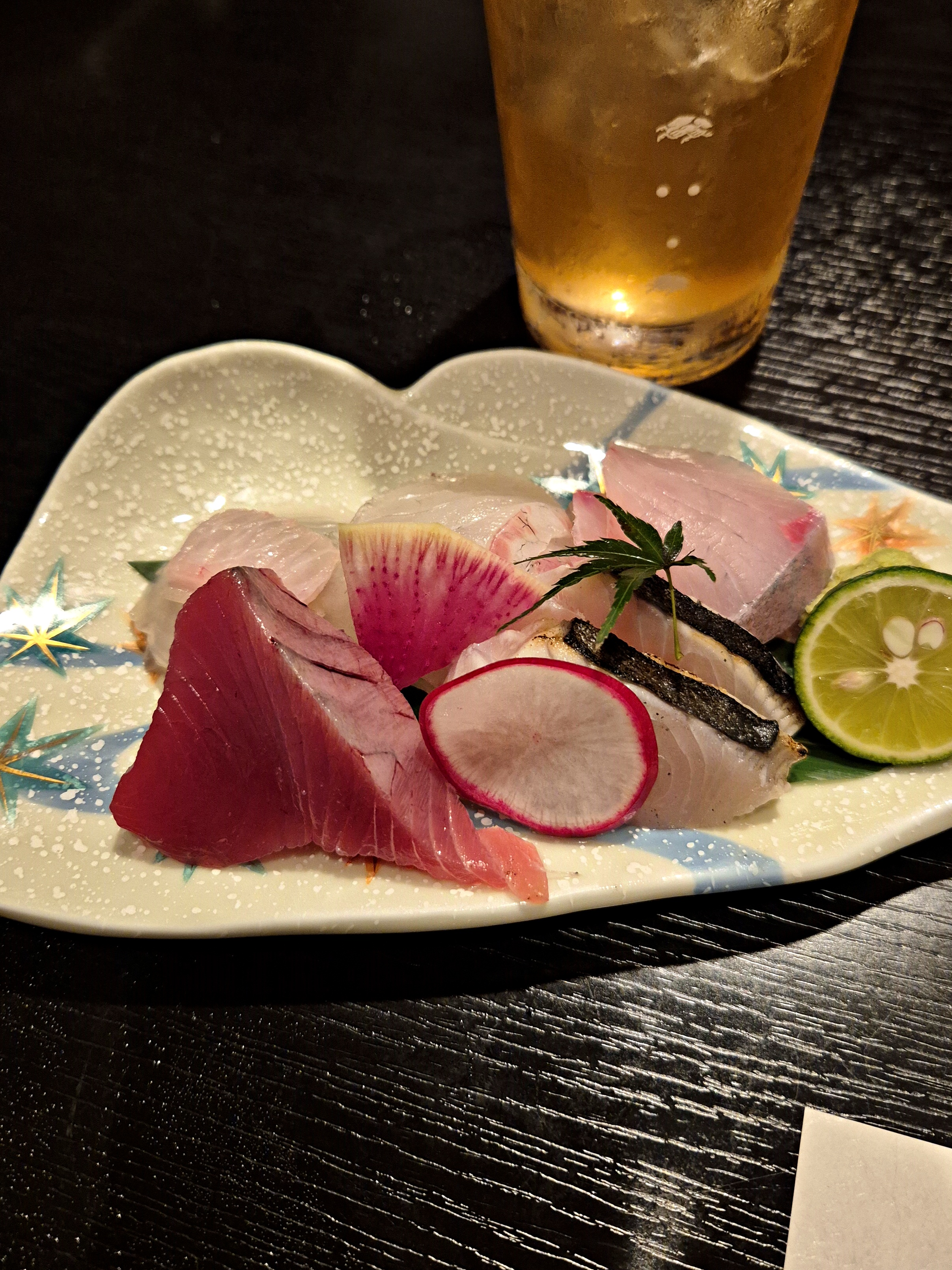 첫술로 주문한 스다치(영귤) 사와. 도쿠시마 특산물이 스다치라고 해서 안 먹어 볼 수가 없었다. 상큼하고 도수가 높지 않아서 첫 잔으로 아주 괜찮았음. 그리고 산미가 있어서 회나 기름진 음식과도 잘 어울렸다.