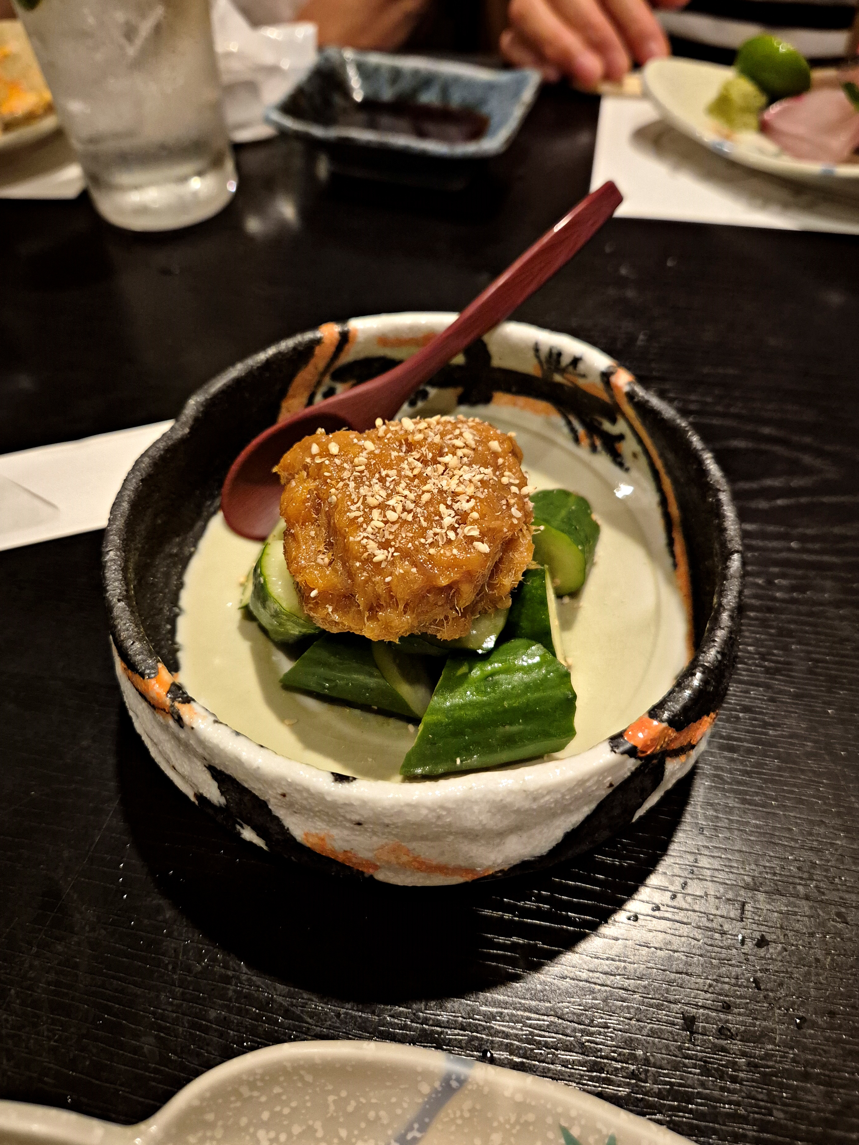 도미된장과 오이. 나는 이 요리가 예상외로 너무 맛있었다. 도미된장이란건 처음 먹어봤는데, 된장에다가 도미채를 섞은 건데 단짠단짠한게 너무 맛있었다. 이 단짠한 도미채와 오이를 같이 먹으니 진짜 밸런스가 좋았는데 이만한 술안주가 있을까 싶었음. 아주 맛있어서 1개 더 주문해서 먹었다.