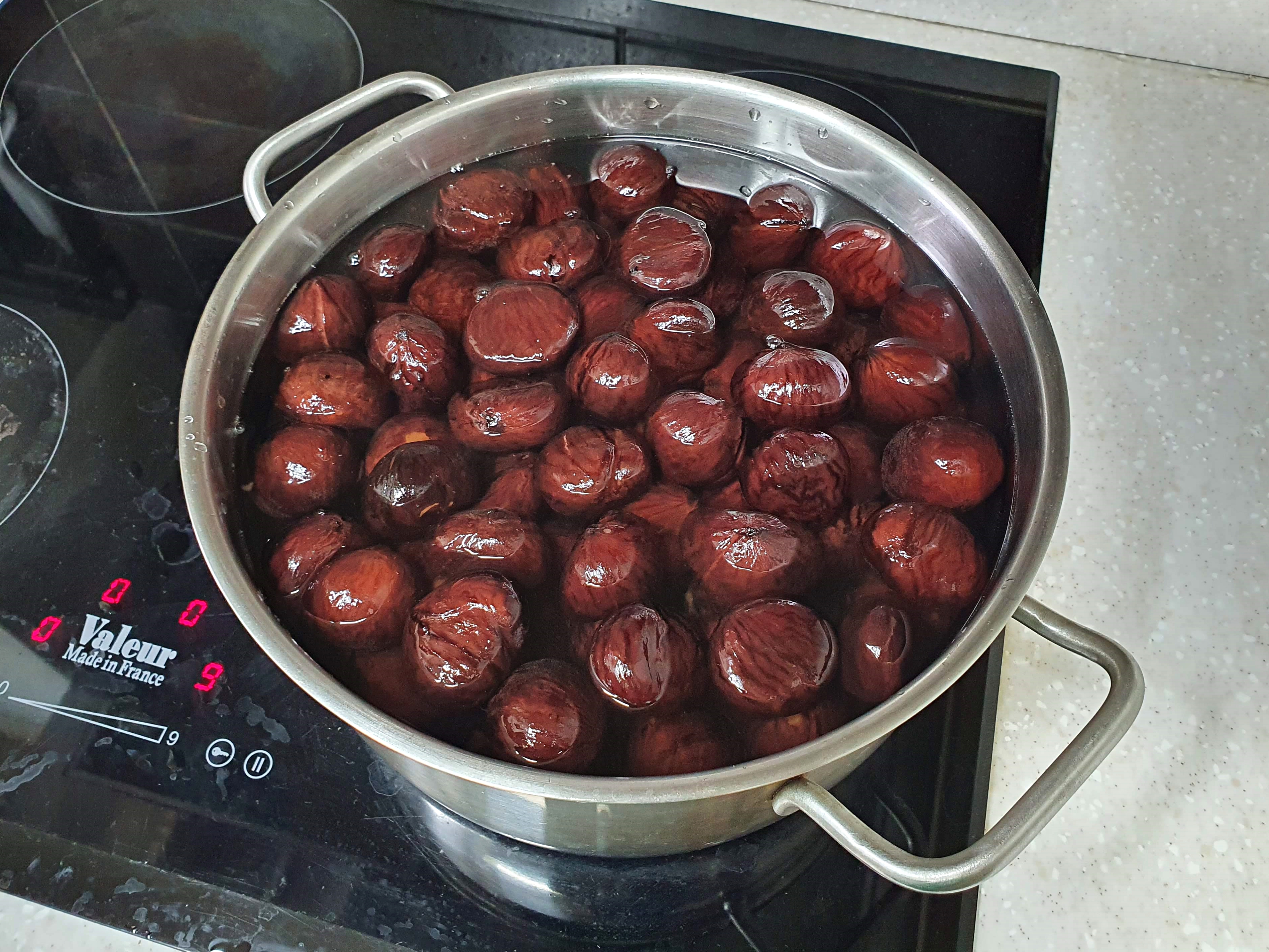 베이킹 소다물에 12시간 동안 넣어둔 밤을 그대로 끓인다. 아 이 소다물이 옷등 다른 데 묻으면 이염이 심하게 되니깐 주의할 것!! 주방용 도구들도 플라스틱이나 고무, 실리콘 재질은 이염이 될 수 있으니 쓰더라도 바로 바로 닦아주자.