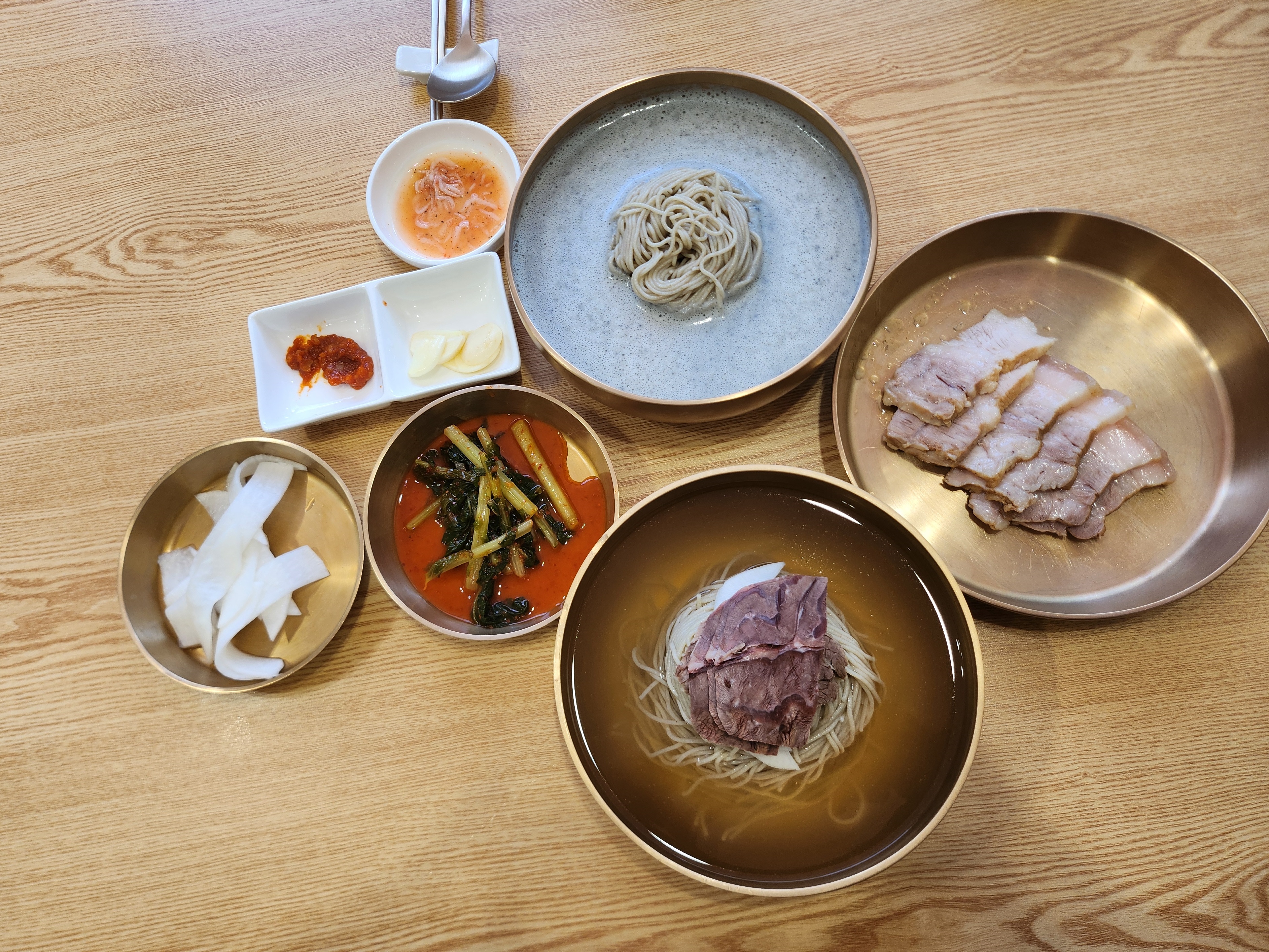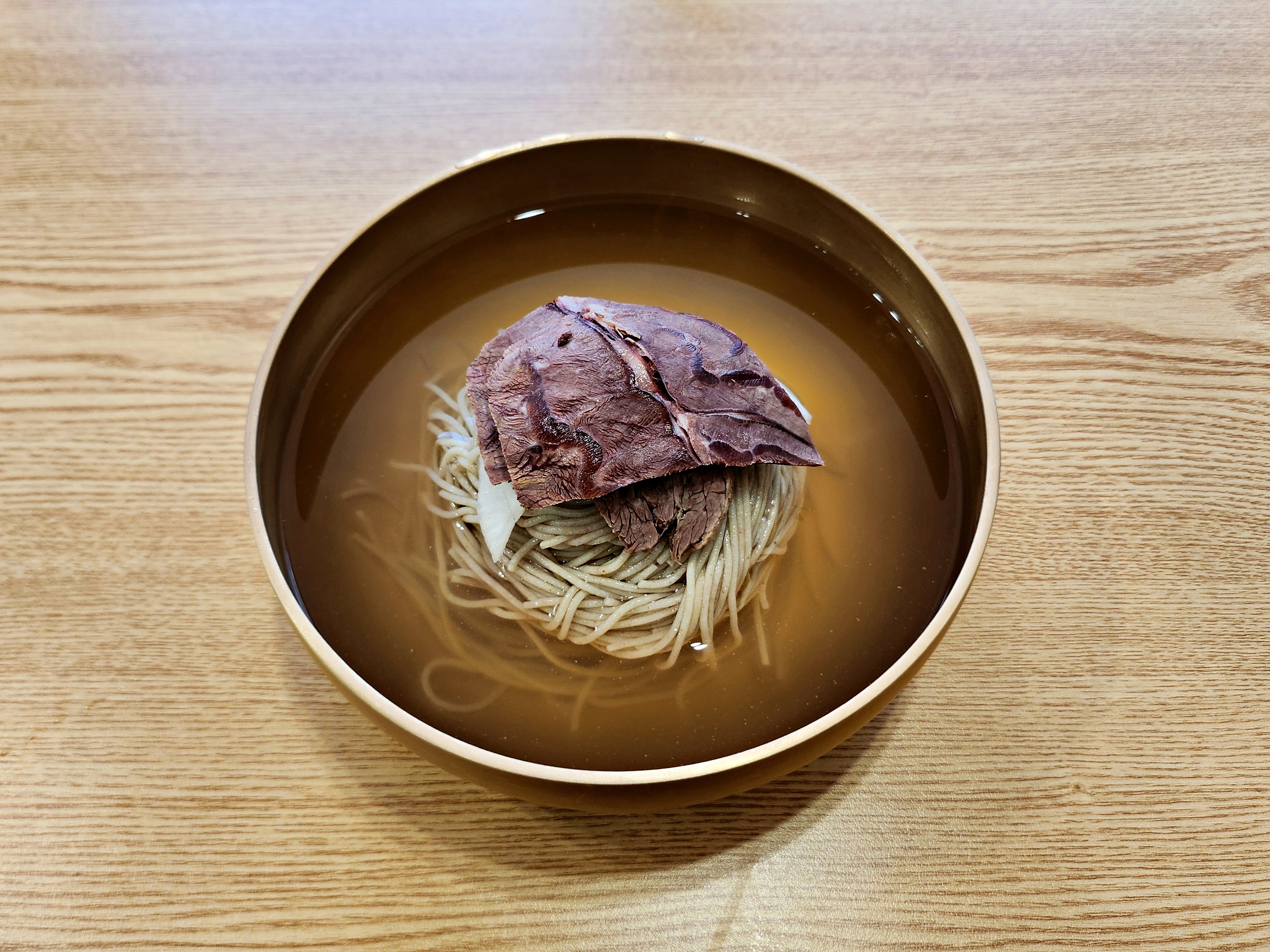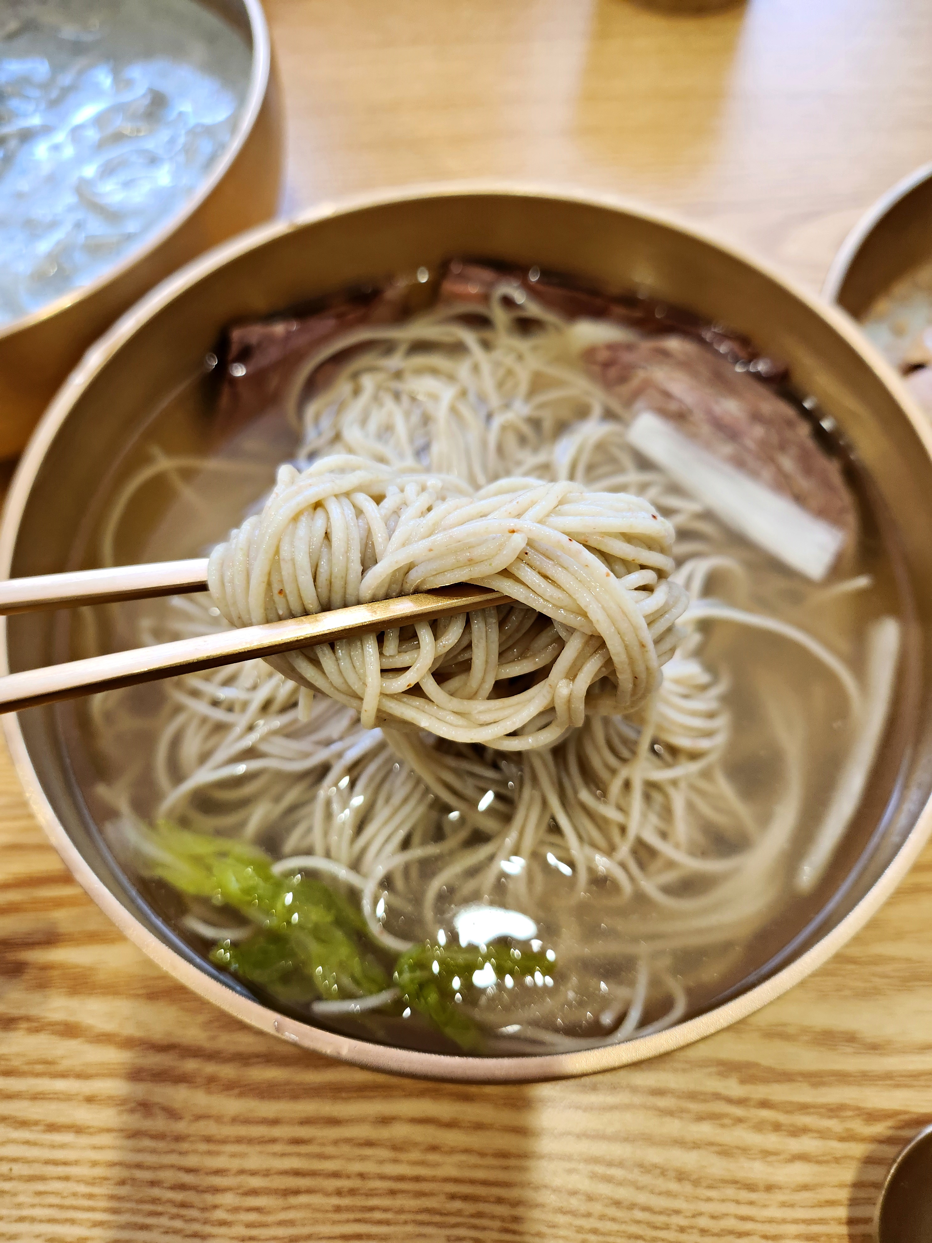 평양냉면. 약간 능라도나 봉피양처럼 육수가 갈색빛인 스타일. 고기고명도 부위별로 얹어주셔서 세심하다는 생각이 들었다.