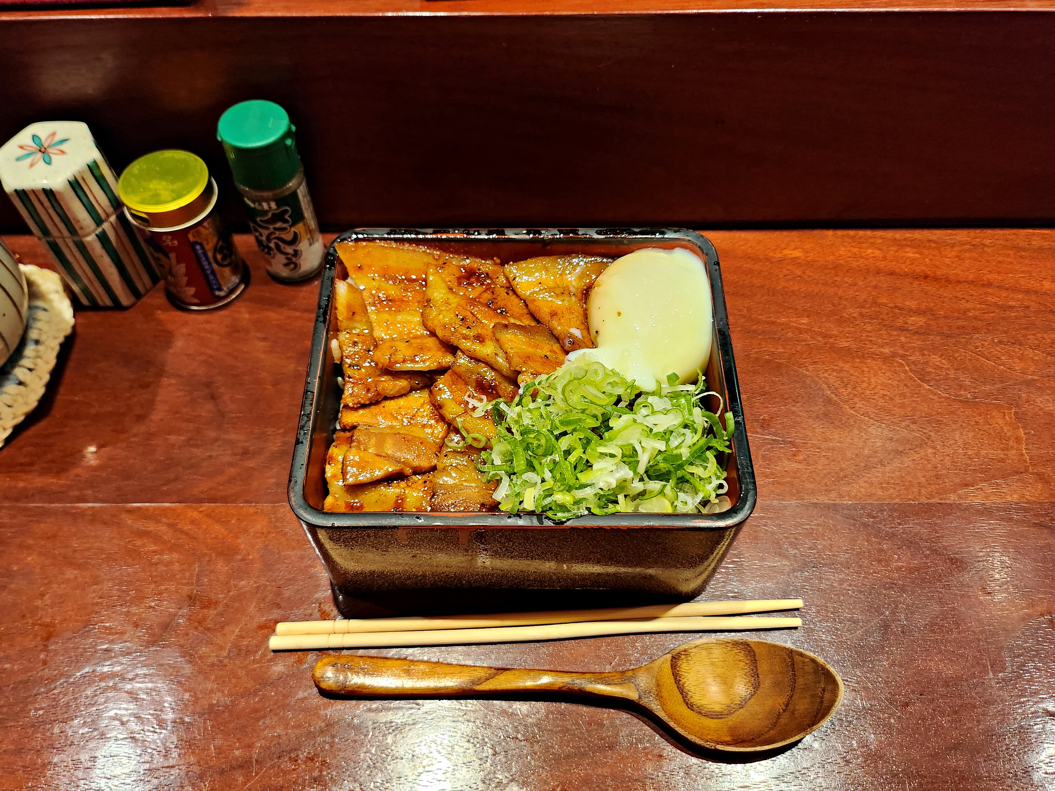 부타동(13천원). 밥 위에 맛있게 구운 삼겹살과 파채가 올라간다. 온센계란은 추가한건지 기본인지는 기억이 잘 안난다.