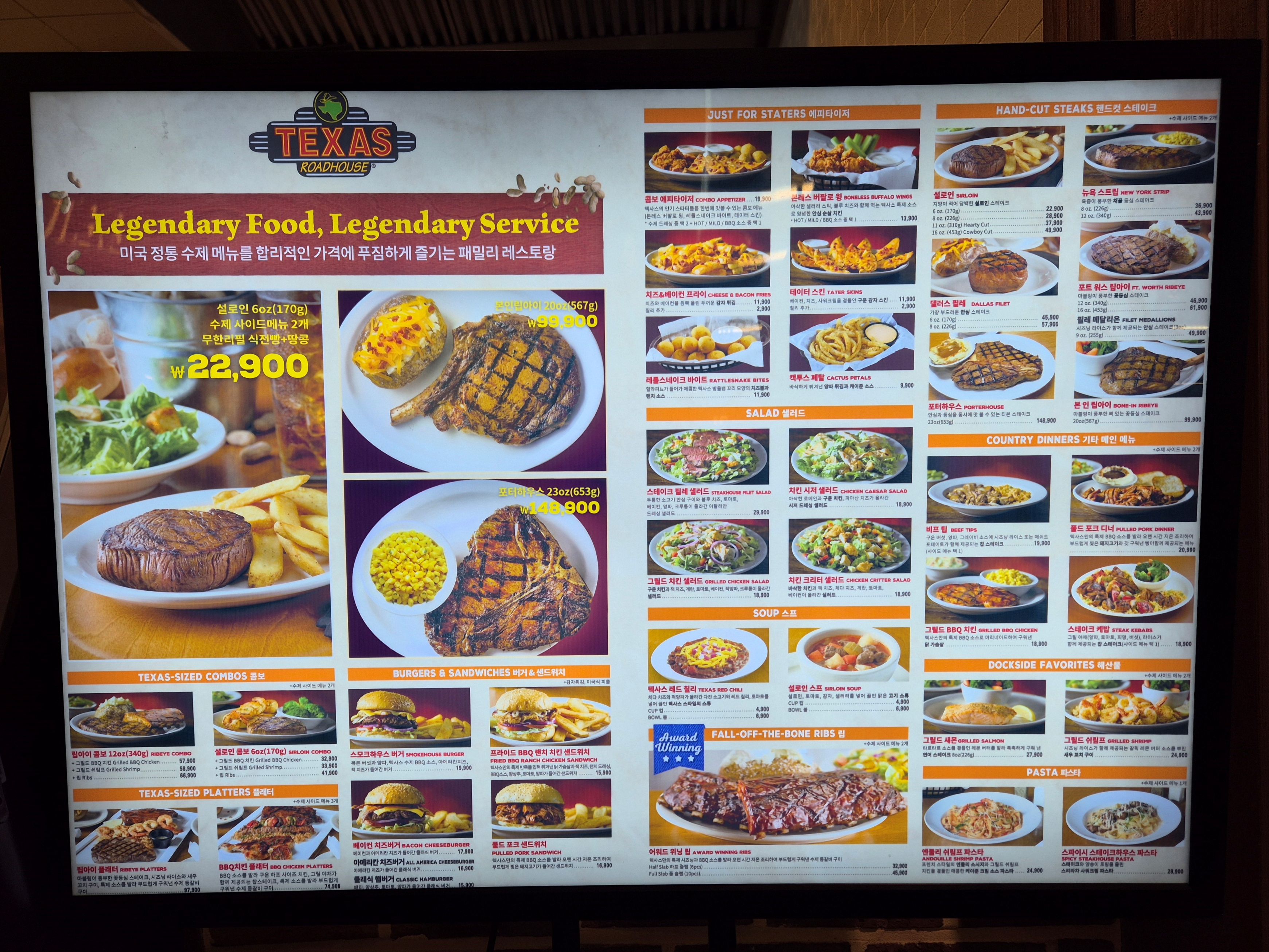 스테이크가 강점인 패밀리 레스토랑 답게 핸드컷 스테이크를 전시해놓음. 미국산 소고기로 알고 있는데 저정도 마블링 수준이 내가 딱 좋아하는 마블링 수준이다. 나는 한우 투쁠이나 일본 와규 높은 마블링 스코어는 너무 과하다고 생각하는 편임.